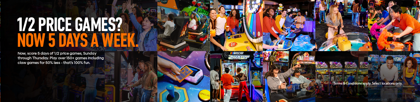 *EAT AND PLAY COMBO: Promotional. Eat & Play Combo. Limited Time only. Offer not valid on Fridays or Saturdays after 5PM. Get an All-American Smashed Burger, Fish & Chips, Boneless Wings, Crispy Chicken Sandwich or Crispy Chicken Strips and $10 Power Card. Fountain drink not available with this offer at all locations. Promotional price starts at $19.99 per person but varies by location. Price may be subject to change at any time. Substitutions available for additional cost. Unlimited gameplay upgrade is valid for 90 minutes starting at time of first gameplay swipe. Offer includes a 30-second lag between each gameplay swipe. Tickets earned on redemption games are capped at 1,500. Not valid on purple swipe games (VR, crane games, pushers, dance games or merchandising games). Valid one per person. Tax and gratuity not included. Not valid with any other promotion. Dine-in only. Restrictions apply. See store for details. Void where prohibited.