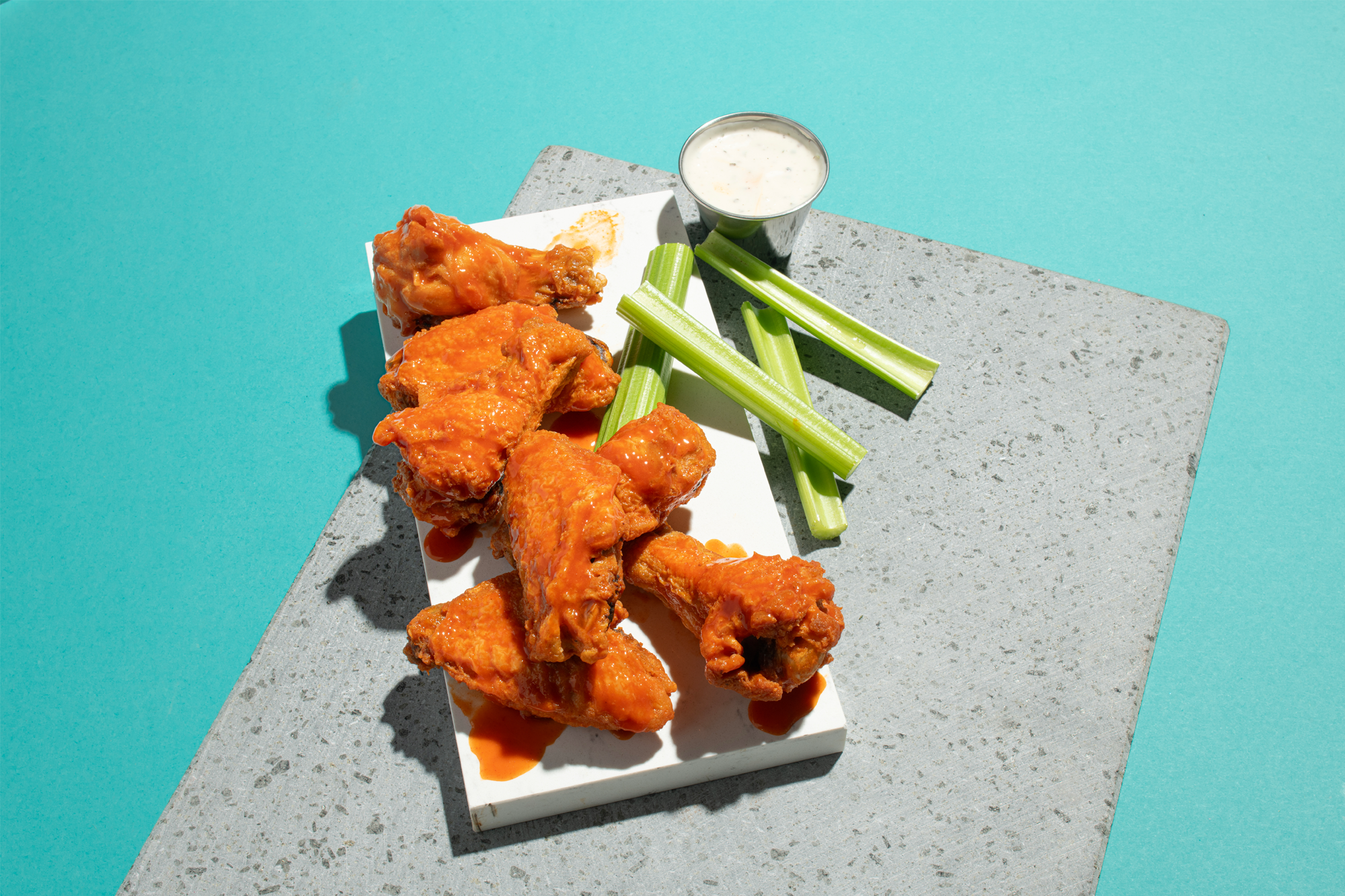 Tossed in one of our sauces or dry rubs. Served with celery sticks and choice of ranch or bleu cheese.