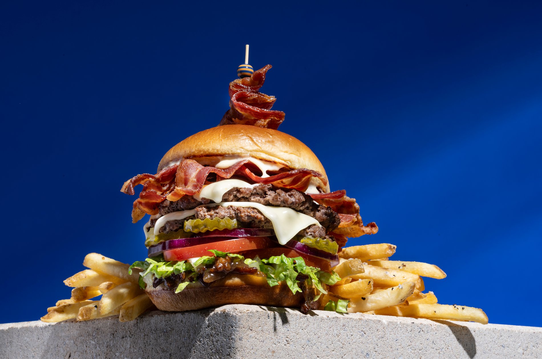 A tasty tribute to our founder. 7oz. burger generously topped with applewood-smoked bacon, American cheese, bacon jam, lettuce, pickles, tomato, onions, and bacon aioli.