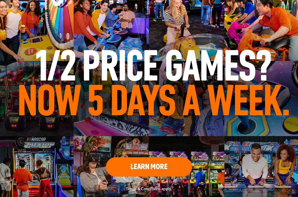 *Half Price Games: Promotional. Limited Time Only. Half Price Games. Offer valid in-store only. Valid only on Sundays through Thursdays. Not valid on Virtual Reality or Human Crane games. Excludes photo booths. In select locations only, offer not valid on purple swipe games (crane games, pushers, dance games or merchandising games). Game Play coupons may not be valid in combination with the Half Price Games offer on select days. Power Card activation fee may apply. Offer cannot be combined with other promotions. Additional restrictions may apply. Offer subject to change or cancellation at any time. Void where prohibited. See store for details.